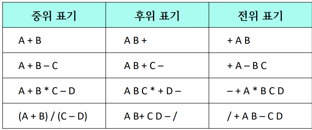 - 프로그램을 작성할 때 수식에서 +, -, * , / 와 같은 이항 연산자는 2개의 피연산자 사이에 위치 : 중위 표기(Infix Notation)