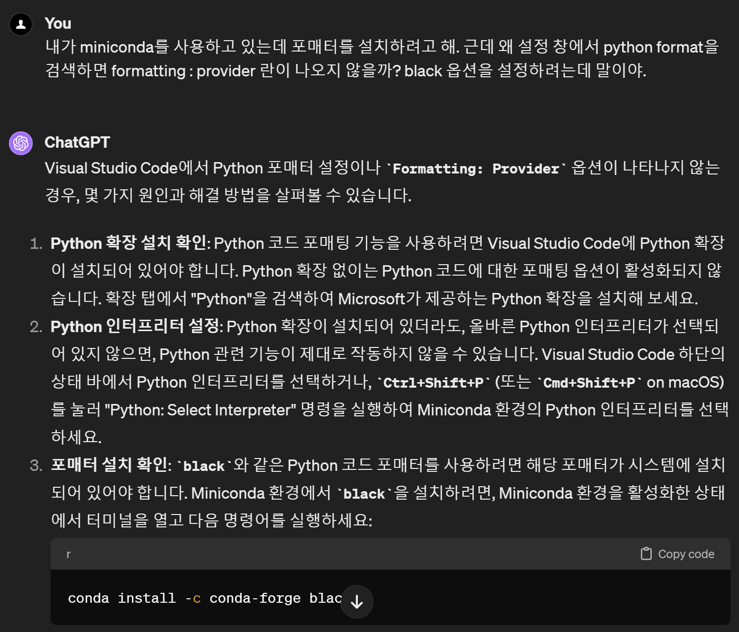 Black Formatter를 설치해주려고 했지만 초반부터 난관에 봉착했다. 하지만 걱정하지 말자. 나의 영원한 따거 ChatGPT에게 조언을 얻어보기로 했다.