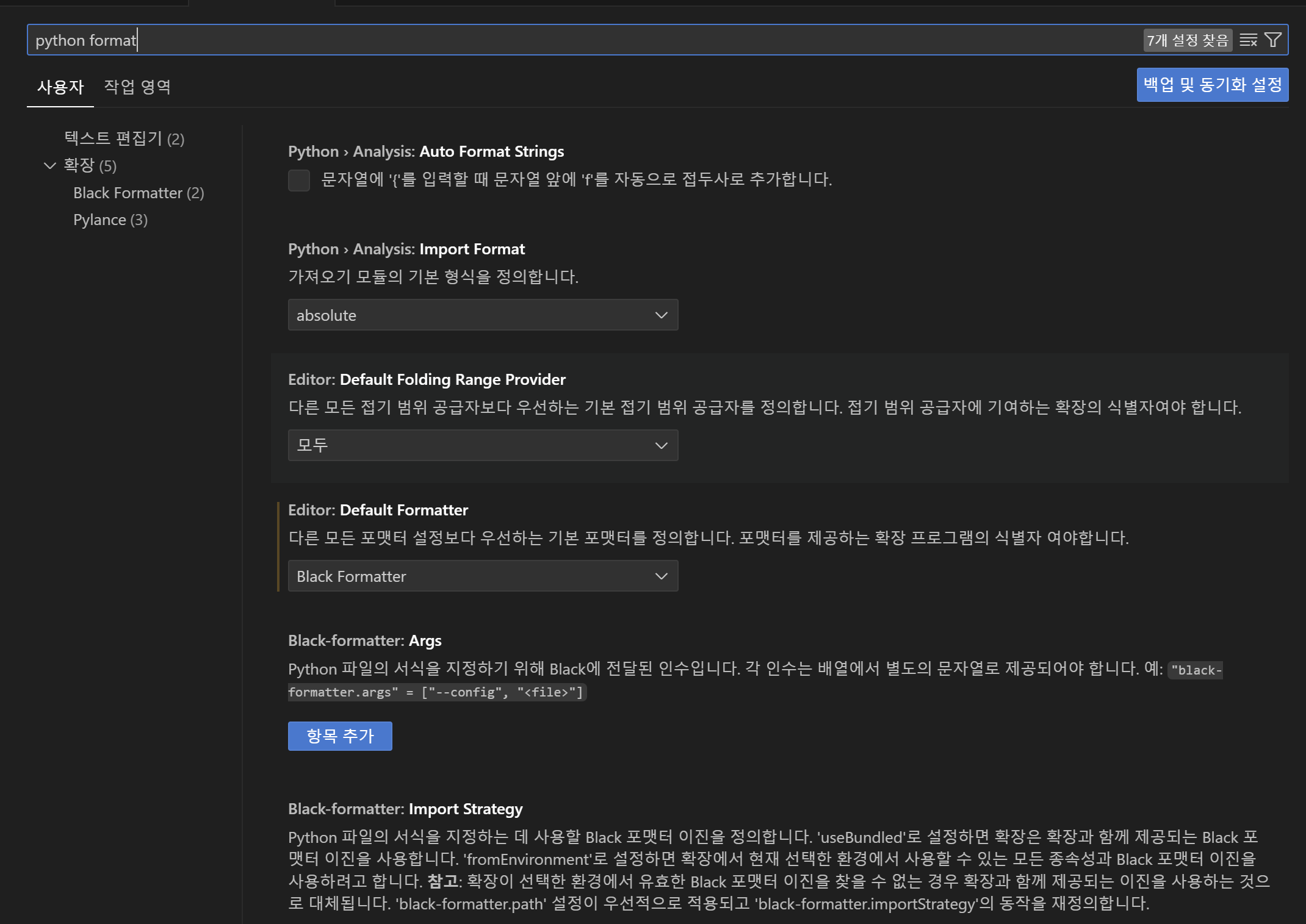 포매터 기능을 추가하기 위해 설정에 들어가서 python format을 검색, 'Python > Formatting : Provider' 를 찾는다.